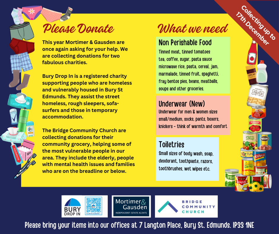 If you have any non-perishable food items, toiletries, or new underwear that you can donate, please bring them into our offices at 7 Langton Place, Bury St Edmunds, Suffolk, IP33 1NE, and we will make sure they get to the right people in time for Christmas.